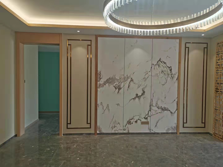 電視背景與沙發(fā)背景局部的木元素和黃銅浮雕構件,使整體空間感覺更加豐富,大而不空、厚而不重,有格調又不顯壓抑。